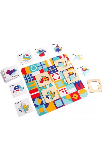 Склад гри: набір включає ігрове поле, дерев'яні фішки-трафарети (наприклад, светр або слон) та картки із завданнями.