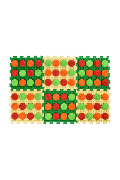 Масажний килимок складається з 6 пазлів "Соті" та 72 модулів-деталей, які кріпляться на основу-пазл. Виготовлений із гігієнічного, гіпоалергенного матеріалу на основі ПВХ.