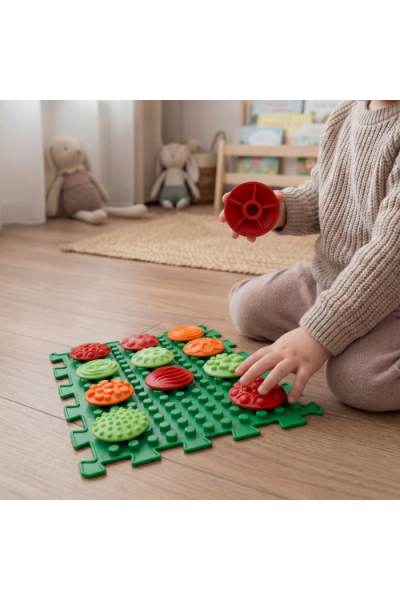 12 видів візерунків мають різну поверхню, що добре розвиває тактильні відчуття та створює різний масажний ефект. Деталі кріпляться як на виступаючі "стовпчики" пазла, так і між ними. Дитина може викладати на пазл різнокольорові візерунки або сортувати їх за кольором, викладати довільно або спробувати скласти фігуру, як мозаїку. Деталі добре тримаються, тому ними можна вільно ходити, масажуючи стопи.