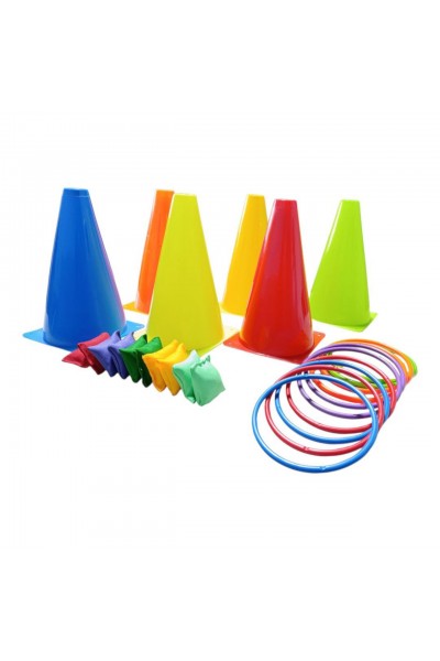 Набір включає предмети, що використовуються для занять і тренувань на спритність. Шість яскравих конусів (синій, помаранчевий, жовтий, світло-жовтий, червоний та зелений). Зазвичай вони використовуються для позначення меж, створення смуг перешкод або напряму руху під час тренувань. 10 кінезіологічних мішечків, які використовуються як ігровий тренажер для покращення координації, уваги, пам'яті, дрібної та великої моторики, а також як метод нейрокорекції у дітей та дорослих. За допомогою цих мішечків розвивають почуття ритму, міжпівкульну взаємодію, і вони допомагають справлятися з труднощами у навчанні (читання, письмо), гіперактивністю та проблемами у саморегуляції. 10 кілець, які часто використовують для вправ на спритність. Набір упакований у сумочку для зручності зберігання та перенесення.