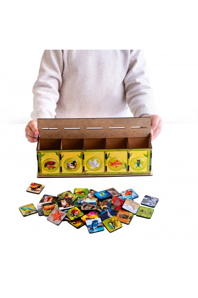 — Комодик-сортер із 5 тематичними отворами для сортування (домашні, дикі, птахи, комахи, морські)